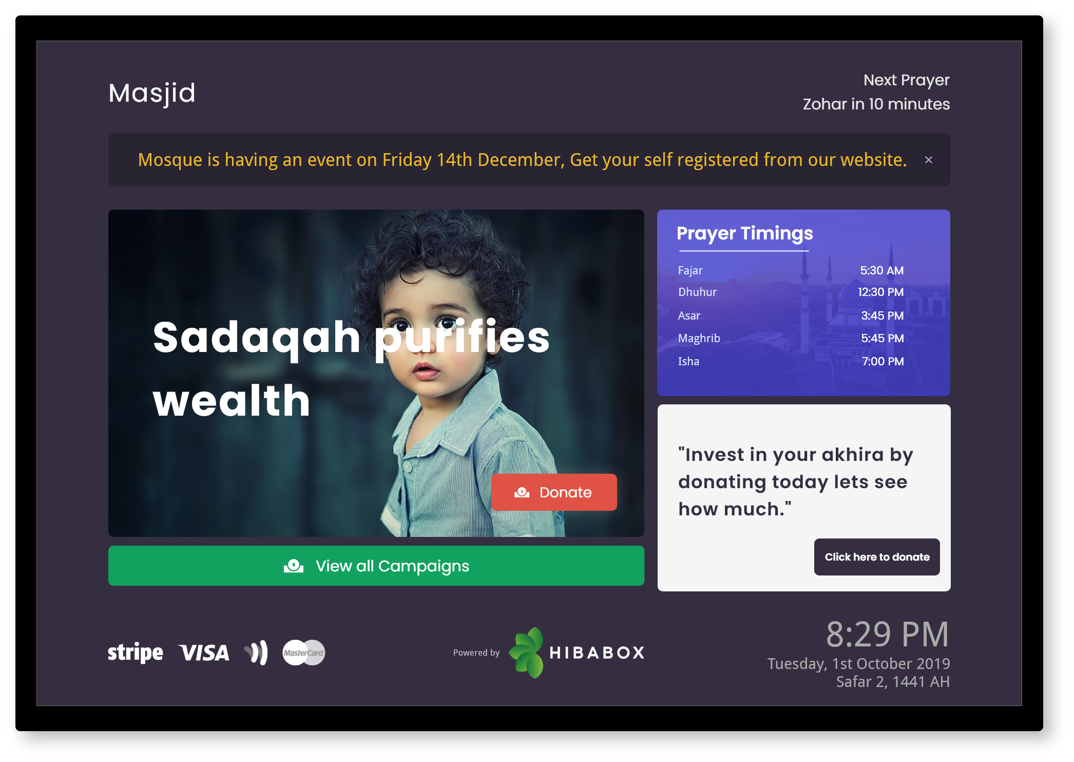 A multi-feature contactless Self-service Donation and Registration Kiosk, specifically built for the mosques and Islamic centres, enabling them to run customised campaigns, pledges, fundraising events, programs and accept donations quickly and simply. Learn More